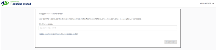 Als u deze pagina voor u heeft wordt er binnen enkele minuten een SMS verzonden naar uw mobiel met de code die u kunt invullen op de plek ‘wachtwoordcode’. Nadat u de code heeft ingevuld kunt u op inloggen klikken (rechts onderaan de voorbeeldpagina hierboven).