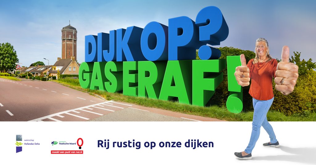 Voor de vierde keer vragen waterschap Hollandse Delta en gemeente Hoeksche Waard aandacht voor het rijgedrag op de dijken. Elke dag gaan vele scholieren en inwoners met de fiets naar school, werk, familie of een vereniging. Veel fietsroutes lopen over dijken waar ook auto’s, vrachtwagens, (zwaar) landbouwverkeer en bussen rijden. Onder het motto ‘Dijk op? Gas eraf!’ vragen wij weggebruikers om rekening met elkaar te houden en zich aan de maximumsnelheid te houden. Dat maakt het voor iedereen veiliger. Door middel van onder andere banners langs de wegen, posters en flyers brengen wij de campagne ‘Dijk op? Gas eraf!’ onder de aandacht bij onze inwoners.