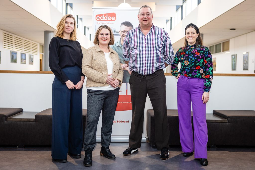 Van links naar rechts: Linda Klop (contractmanager Eddee Zorggroep), Jolanda Verkaik-Vietsch (directeur-bestuurder Eddee Zorggroep), René Peters (wethouder Zorg en Welzijn Gemeente Hoeksche Waard) Cher Steinfeld (adviseur Gezondheid en Informele Zorg Gemeente Hoeksche Waard)