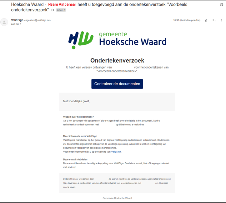 Een digitaal onderteken verzoek van de gemeente Hoeksche Waard komt altijd via uw mailadres binnen.